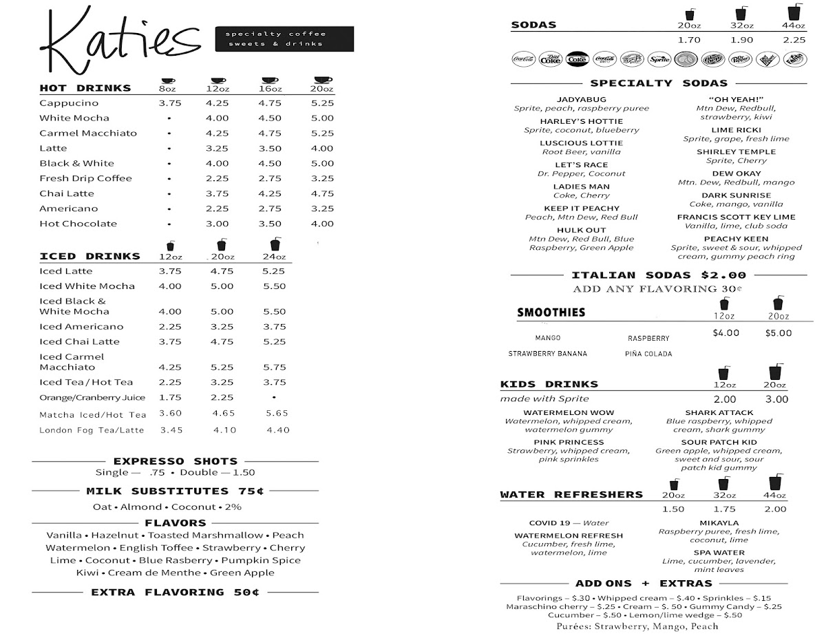 Step inside and let your taste buds wander through the delightful offerings of Katie's Specialty Coffee, Sweets And Treats Menu. From the moment you peek at the menu, it’s clear that every item is crafted with care, whether you’re craving a rich, velvety coffee or a sweet treat to brighten your day. The drinks range from classic favorites to creative blends that surprise with every sip, while the pastries and desserts feel like little bursts of happiness, perfect for sharing-or not.